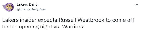 湖人跟队记者Jovan buha表示他相信威少不会在新赛季揭幕战首发出战;换言之,名记认为湖人揭幕战大战勇士,预计威少将替补出战。