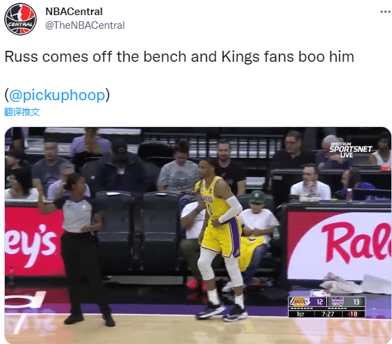 第一节7分27秒,湖人12-13落后国王1分,威少换下克里斯蒂替补上场,现场的国王球迷狂嘘他;这是威少08年后首次替补上场,也是时隔14年再次替补。