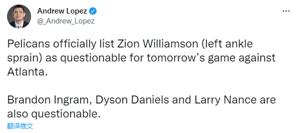 JRS直播网10月12日,新奥尔良鹈鹕官宣公布下一场对阵老鹰的伤情报告,锡安-威廉森左脚踝扭伤出战成疑,英格拉姆(左第五脚趾酸痛),戴森-丹尼尔斯(右脚踝扭伤)和小拉里-南斯(右脚酸痛)也被列为出战成疑,50%可能性出战;英格拉姆或缺席全部季前赛,此前他已经连续缺席4场。
