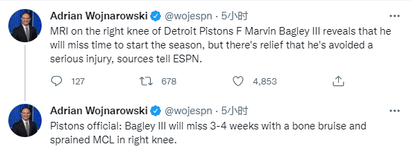 JRS直播网10月13日,活塞新星马文-巴格利的核磁检查结果出炉,据ESPN名记沃纳罗斯基报道,巴格利的伤情确诊为右膝骨挫伤以及右膝副韧带扭伤,将因伤缺席3-4周,缺席常规赛开始阶段,但所幸他免遭十字韧带撕裂的重伤。