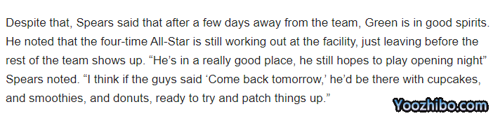 格林何时归队暂无具体日期,不过据Spears透露:在离开球队几天后,追梦的精神状态很好;他目前还在勇士训练馆训练,只是会在其他队员出现之前离开。他的状态真的很好,他仍然希望在揭幕战上场。我在想,如果勇士让他明天归队,他一定会带着纸杯蛋糕、冰沙和甜甜圈,准备好努力去修补关系。