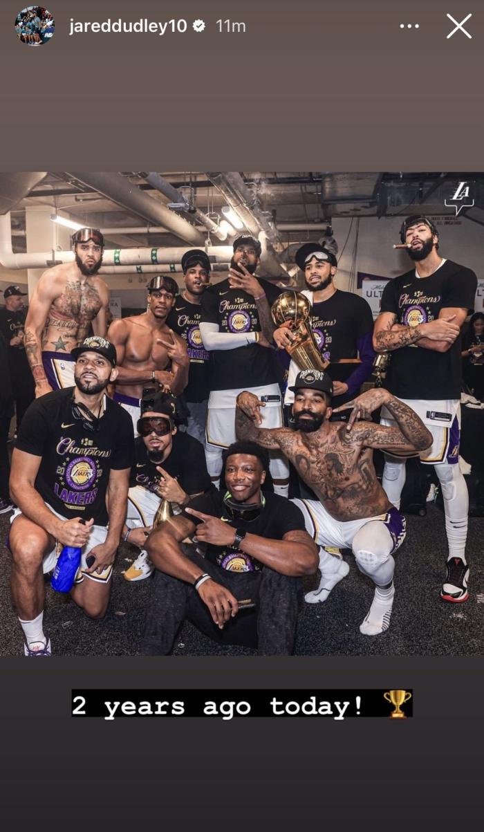 一晃两年过去了,湖人2020年夺冠阵容仅仅只剩下詹姆斯和浓眉两大核心,其他夺冠成员都已离队;值得一提的是,杜德利也晒当年的夺冠合影,并且配文:2年前的今天夺得总冠军。