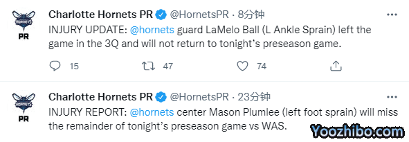 黄蜂官方宣布,球队后卫三球和球队中锋普拉姆利都因左脚踝扭伤而退出本场比赛。