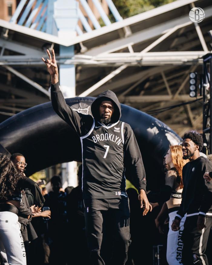 篮网官方还晒出三巨头的入场照,杜兰特和西蒙斯都举手向球迷致意,欧文则是展示他的球衣;配文写道:我们爱你,布鲁克林。