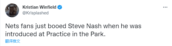 不过纳什亮相时遭狂嘘,据篮网记者Kristian Winfield透露,当介绍纳什出场时,现场的球迷为他送上了嘘声;上赛季纳什的执教能力遭质疑,尤其是季后赛0-4被凯尔特人横扫之后,外界呼吁篮网解雇纳什,不过即使今夏杜兰特逼宫球队并且要求球队解雇纳什,纳什仍执掌篮网帅印。