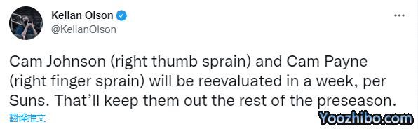 JRS直播网10月08日,太阳队连伤两大主力,据太阳随队记者Kellan Olson报道,卡梅隆-约翰逊(右拇指扭伤)和佩恩(右手指扭伤)都将在一周内重新评估伤情,他们都将无缘季前赛剩余比赛。