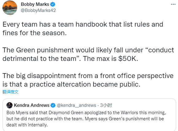 鲍勃-迈尔斯透露,勇士不会禁赛格林,但内部会对他处分;对此NBA薪资专家Bobby Marks表示:每个球队都有一本球队手册,列出了本赛季的规则和罚款,格林可能因对球队有害的行为被罚款,最高罚款5万美元;让勇士高管最失望的是他们之间的冲突被传开了。