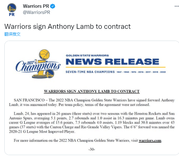 勇士和安东尼-兰姆签下的一份训练营合同。