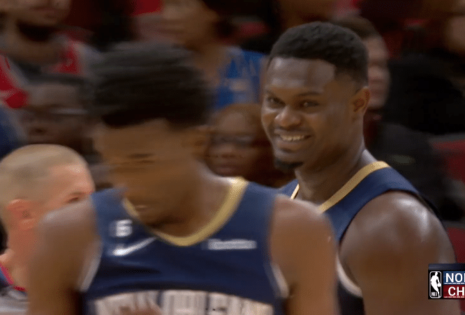 锡安联手CJ-麦科勒姆、瓦兰、马绍尔和琼斯首发出战,本场比赛,锡安第一次出手没有命中,9分40秒,麦科勒姆持球上篮不中,锡安在禁区补篮打成2+1,这是锡安伤愈复出后打进的第一球,锡安和队友击掌;随后锡安上演不可思议的追身钉板大帽,不过这一球被裁判吹成干扰球,锡安盖帽不算。
