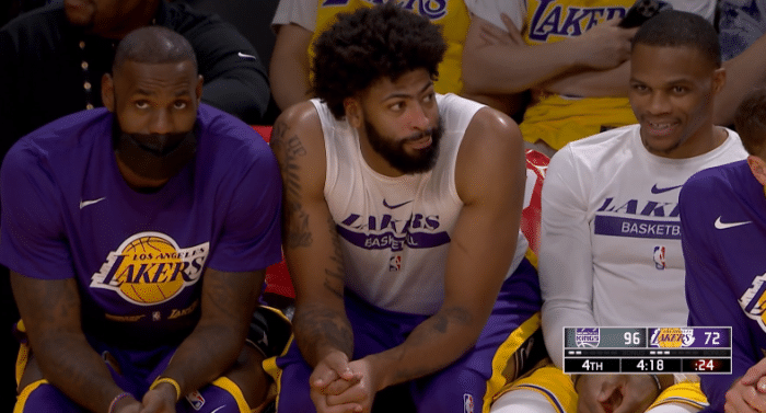 JRS直播网10月04日讯 NBA季前赛湖人主场30分惨败国王,詹姆斯手感冰凉,出战15分钟7投0中、三分2中0拿到4分2助攻,仅靠罚球拿到4分;浓眉9投4中轰下11分11篮板2助攻1抢断,威少3投2中拿到5分3篮板3助攻,三巨头都是仅打两节便早早打卡下班。