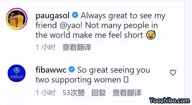 JRS直播网10月03日讯 ,前NBA球星大加索尔更新社媒,晒出了一张自己和姚明在女篮世界杯上的合影。合影中,2米13的大加站在2米26的姚明身边。大加配文写道:“见到我的朋友姚明总是很高兴!世界上没有几个人能让我感觉自己矮小。” FIBA女篮世界杯官媒留言道:“很高兴看到你们对女性的支持。”