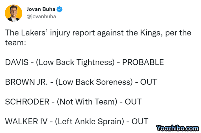 JRS直播网10月03日讯 ,湖人官方公布了明日对阵国王季前赛的伤病名单,浓眉被标为(腰部紧张)大概率出战(probable,上场可能性75%),另有3人确定缺席:小布朗(腰部酸痛)、沃克四世(左踝扭伤)和施罗德(未随队)。