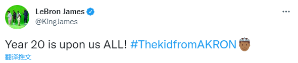 詹姆斯晒照和暴扣视频,发推写道:第20个赛季即将来临!#来自阿克伦的孩子!