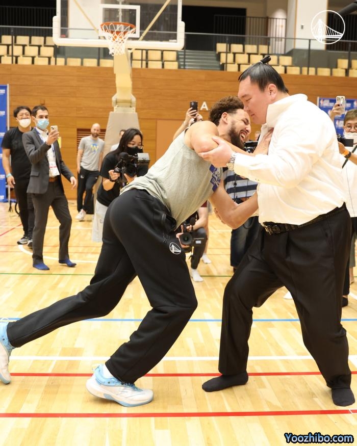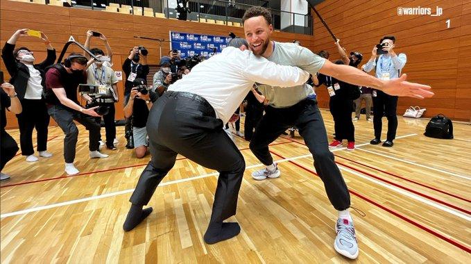 勇士备战东京季前赛,库里和汤普森都体验相扑,使出全力仍推不动专业的相扑选手;勇士备战季前赛欢乐多,库明加举起小女孩扣篮,库里仰望篮筐振臂庆祝;库里教小女孩打球并且为其签名。
