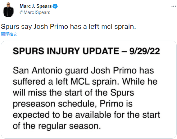 JRS直播网09月30日,马刺官方宣布,球队二年级后卫约什-普里莫在训练营中遭遇左膝内侧韧带扭伤,将至少缺席初段的季前赛,他的伤势并不算严重,马刺预计普里莫将在常规赛初期复出。
