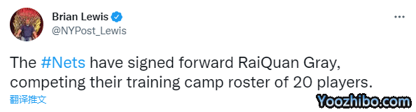 JRS直播网09月27日,据名记Brian Lewis报道,篮网已经签下前锋雷匡-格雷,双方签下一份训练营合同;篮网训练营20人大名单出炉,杜兰特、欧文和西蒙斯新三巨头领衔15+2冲冠阵容。