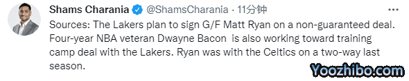 JRS直播网09月26日,湖人官方裁掉一人后连续签下两名球员,据名记Shams报道,湖人计划以非保障合同签下马特-瑞安,还用训练营合同签德维恩-培根;湖人20人大名单满额,三巨头领衔冲冠。