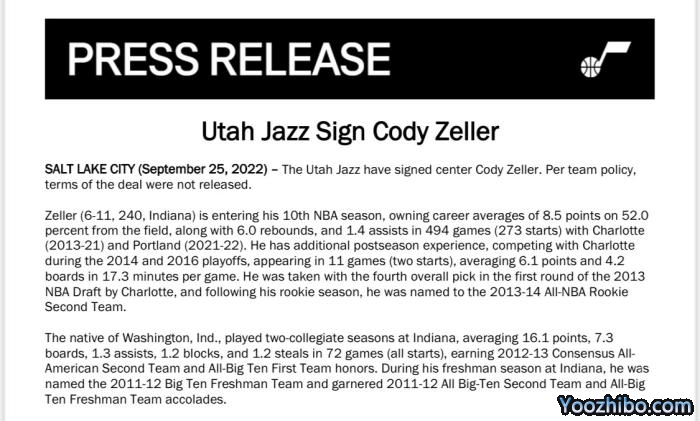JRS直播网09月25日,犹他爵士官方正式宣布,球队已经签下科迪-泽勒,合同细节暂未曝光,据此前报道,双方只是签下一份训练营合同;泽勒曾是被乔丹视作建队基石,当年选秀力压字母哥,如今仍在为一份正式合同而奋斗。