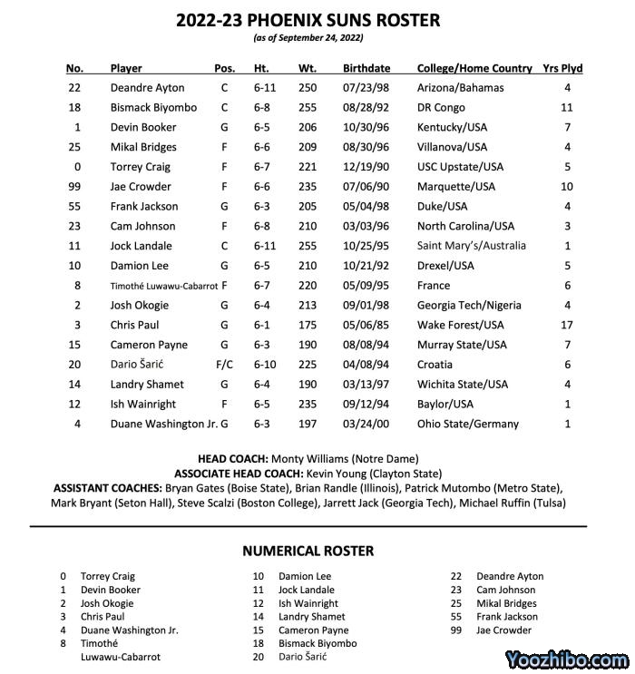 太阳队18人训练营大名单出炉,他们分别是布克、艾顿、保罗、布里奇斯、约翰逊、克劳德(99号)、沙梅特、佩恩、达米恩-李(10号)、比永博、克雷格、伊什-韦恩赖特)、萨里奇、弗兰克-杰克逊(55号)、奥科吉、兰代尔、华盛顿、卢瓦乌(8号)。