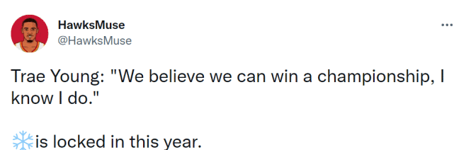 虽然特雷-杨放话球队要冲冠,但外界对他们不是那么看好。最新的夺冠赔率排名显示,老鹰的夺冠赔率只有+5000,排名联盟第17位。就东部而言,夺冠赔率在他们前面的球队包括凯尔特人、雄鹿、篮网、76人、热火、骑士和猛龙。要想冲出东部,难度真的不小。