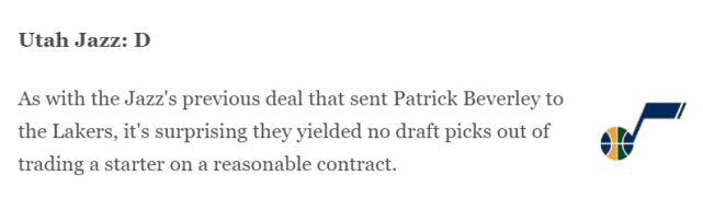 ESPN也公布了这笔交易的评级,活塞得到了A的最高分,而爵士则被评了D的超低分。