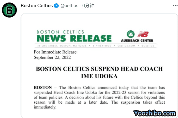 JRS直播网09月22日日,凯尔特人官方正式宣布,乌度卡因违反球队纪律,被球队禁赛整个2022-23赛季,禁赛立即生效;绿军主帅乌度卡因出轨女职员被停职一年,之后乌度卡公开道歉并且表示接受球队的处罚;乌度卡被禁赛整个赛季,乔-马祖拉将担任凯尔特人临时主帅。