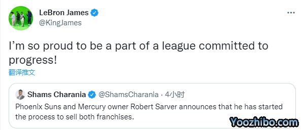 对于萨沃宣布出售球队,湖人当家球星詹姆斯转发了这一消息,并且写道:我很自豪能成为致力于联盟进步的一员。