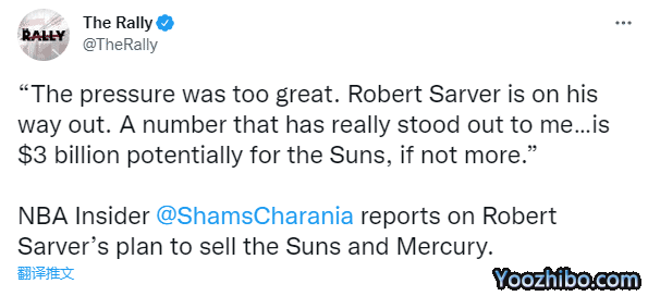 JRS直播网09月22日,太阳老板萨沃正式宣布出售球队,名记shams揭秘内幕,詹姆斯、保罗等球星发声让萨沃顶不住压力,太阳售价或达30亿美元。