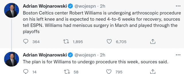 JRS直播网09月21日,据名记Woj报道,消息人士透露,波士顿凯尔特人的中锋罗伯特-威廉姆斯三世将在本周接受左膝关节镜手术,他预计需要4-6周的时间康复。绿军再次受到伤病打击,此前,绿军新援加里纳利因伤赛季报销。