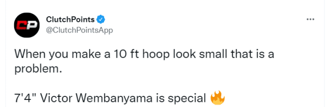 美媒clutchpoints也感慨道:“当你让10英尺高的篮筐看上去很矮小时,那就是个大问题了。7英尺4英寸的文班亚马很特别。” 此前报道称,文班亚马的表现已经引起多支NBA球队的关注。马刺的波波维奇,凯尔特人的史蒂文斯都亲赴欧洲考察过他。文班亚马也很自信,认为自己进攻端结合了杜兰特和字母哥的特质,而防守端可以扮演和戈贝尔类似的角色。