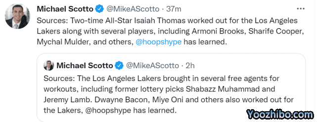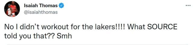 JRS直播网09月18日据NBA名记Michael Scotto报道,湖人试训了多位自由球员,其中包括沙巴兹-穆罕默德、杰里米-兰姆、德维恩-培根、米耶-奥尼、小托马斯、阿莫尼-布鲁克斯、沙里夫-库珀和米查尔-穆尔德。毫无疑问,两届全明星小托马斯是名气最大的球员,穆尔德是勇士旧将,兰姆的实力也很出色。小托马斯第一时间辟谣,表示自己并未为湖人试训。他写道:“不,我没有为湖人试训!!!哪个消息源告诉你的?”