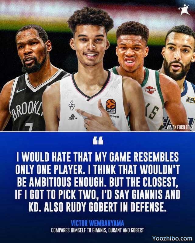 “最接近的比赛风格,如果我一定要选择两个,我会说是扬尼斯(字母哥)和KD(杜兰特)……防守端的风格,类似于戈贝尔。我想在一些领域成为有史以来最好的。”谈到自己的比赛风格时,文班亚马自信满满,认为自己是三大球星的结合体。