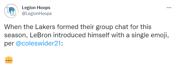 JRS直播网09月16日,据美媒Legion Hoops报道,湖人球员科尔-斯威德爆料,本赛季,勒布朗-詹姆斯在湖人群自我介绍时用了一个“皇冠”的表情,这也是老詹最常用的一个表情,并且经常在社交媒体上称自己为国王;詹姆斯迷你训练营的举办地点和时间已经确定下来。