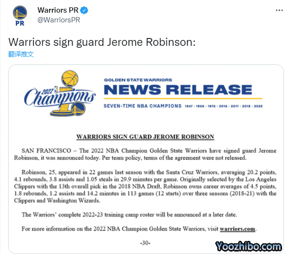 JRS直播网09月09日讯 ,勇士正式官宣签下18年13号秀杰罗姆-罗宾逊,双方签下一份为期1年的合同,根据球队政策,合同细节暂未曝光;勇士新赛季19人卫冕大名单出炉,库里领衔再冲冠,仍在等待伊戈达拉。