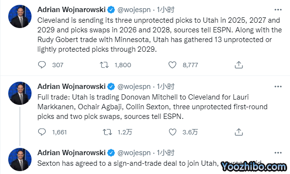骑士送走塞克斯顿、马尔卡宁和新秀后卫(2022年首轮14顺位)奥侪-阿巴基,还有3个首保护的首轮签(2025年、2027年和2029年)以及两个首轮签互换资格(2026和2028年),从爵士得到米切尔。
