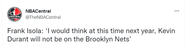 JRS直播网08月30日讯 虽然杜兰特已经撤回了交易申请,但纽约名记弗兰克-伊索拉认为他只会留守篮网一个赛季。北京时间8月30日,伊索拉在节目上表示:“明年的这个时候,我不认为杜兰特还会留在篮网。”