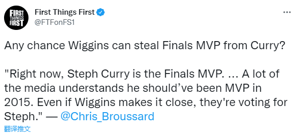 G5之后外界热议维金斯要和库里争抢FMVP,那么嘴哥有机会吗?名嘴Chris Broussard在节目中表示:现在,斯蒂芬-库里是总决赛MVP,很多媒体都知道他应该成为2015年的总决赛MVP;即使威金斯接近,他们也会把票投给库里。