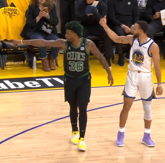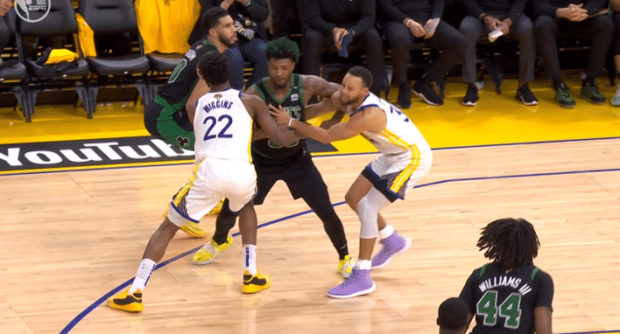 下半场,凯尔特人疯狂反扑,在一次进攻中,斯玛特为塔图姆挡拆,一只手拽住维金斯,另一只手夹住库里的手臂;斯玛特用这样的方式挡住维金斯和库里,塔图姆投进空位三分,对此库里有些不满,冲着场边的裁判,示意自己的手臂被斯玛特夹住了,被裁判无视。