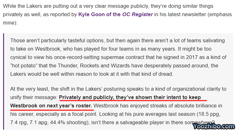 湖人记者Kyle Goon表示,无论是公开还是私下里,湖人队都表明了让威少留在下赛季大名单中的意图;换言之,现在湖人对待威少的态度已经发生很大的变化,貌似不再寻求交易威少,而是计划留下威少。