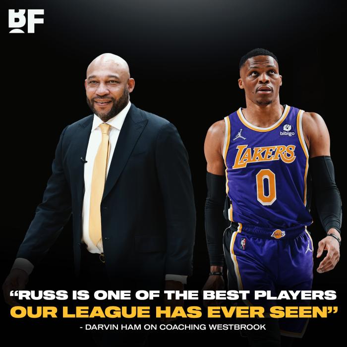 JRS直播网06月13日讯 据美媒Silver Screen and Roll报道,湖人队除了公开表示他们想让威少留在球队大名单上之外,他们私下也传递了同样的信息;湖人计划留下威少,预计后者将在月底执行4700万美元的球员选项,将再次力压詹姆斯成队内薪资最高的球员。