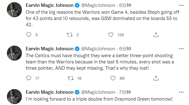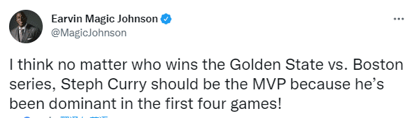 湖人5冠王魔术师约翰逊发推写道:我认为无论勇士和凯尔特人谁赢得总决赛,斯蒂芬-库里都应该成为系列赛的MVP,因为他在前四场比赛中一直占据主导地位!