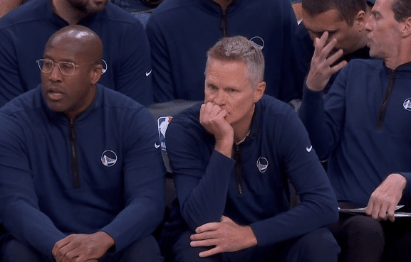 G4首节,斯玛特突破禁区上篮,塔图姆造库里犯规,罗威禁区大帽库里以及抢到进攻篮板二次补篮得分,斯玛特抢断库里,塔图姆轰进三分,凯尔特人11-4开局;很明显,勇士五小在场,内线被打爆,7分23秒科尔主动换下波特,卢尼上场,仅打4分37秒便放弃五小,相当于科尔宣布变阵失败。
