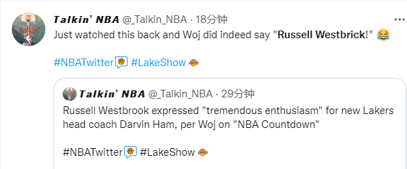 名记沃纳罗斯基透露威少对新湖人主帅达尔文-哈姆表示了极大的欢迎,但该记者却误将威少名字叫错“Russell Westbrick”(Westbrick一般是球迷拿来形容威少在疯狂打铁)。