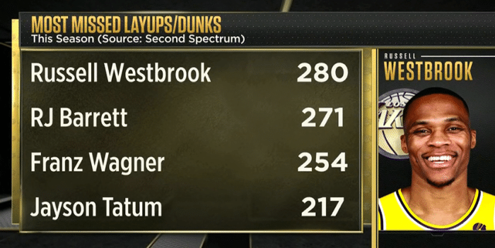 本赛季威少总共为湖人出战78场比赛,场均拿到18.5分7.4板7.1助攻和1次抢断,投篮命中率44.4%和三分命中率29.8%;据统计,威少本赛季上篮和扣篮不进的次数是280次,如此扎心的数据高居联盟第一,巴雷特271次排名第二,魔术球员瓦格纳254次,塔图姆217次排在第四位。