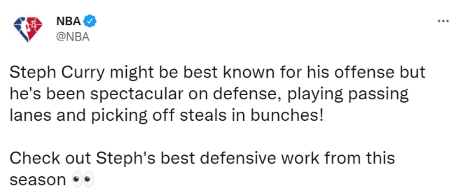 JRS直播网06月08日讯 ,NBA官方社媒晒出了库里本赛季的防守集锦,并配文写道:“斯蒂芬-库里最出名的可能是他的进攻,但他在防守端的表现也非常出色!”集锦中,库里的抢断和盖帽让人印象深刻,引起球迷热议!