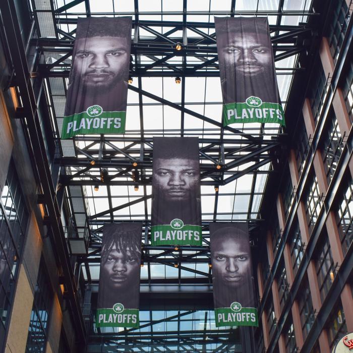 根据赛程,总决赛G3将在6月9日上午9点开打,双方转战波士顿,目前TD北岸花园球馆外已经贴满了“主场总决赛”的海报,总决赛氛围浓烈,这将是对勇士众将的一大考验。