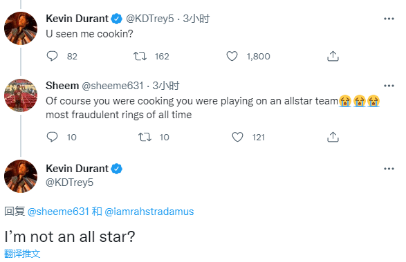 还有球迷表示杜兰特在全明星球队夺冠是史上最具欺诈性的戒指,KD回应:难道我不是一名全明星吗?