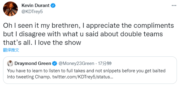 杜兰特又回应:哦,我看到了,我的兄弟,我很欣赏你的赞美,但我不同意你所说的双人包夹,仅此而已。我喜欢这个节目。