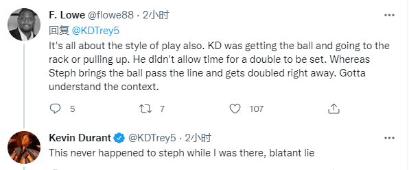 有球迷在评论区回复杜兰特:这和比赛风格不同有关,杜兰特持球进攻,没给对手包夹的时间,而库里运球刚过半场就被包夹了;杜兰特回应:当我在场上时,库里从未被包夹过,明目张胆的谎言。