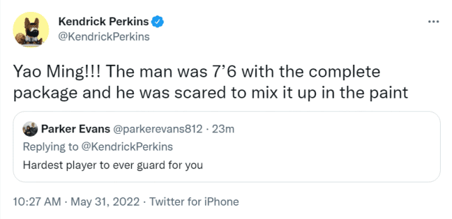 JRS直播网05月31日讯 ,名嘴肯德里克-帕金斯在社媒上与球迷们互动。一位球迷问他,谁是你防过最难防的球员,帕金斯的答案是姚明。“姚明!!!他身高7尺6,还带有全面的技能包,他在内线结合这些东西就太可怕了。”